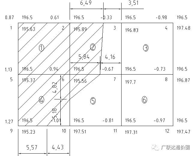 由图可见,场地已由零点线不仅将挖方和填方区分开,而且将场地划分为正方形、五边形、梯形和三角形。无论何种图形,只要先求出每个图形的平均施工高度,再乘以图形面积即可。
