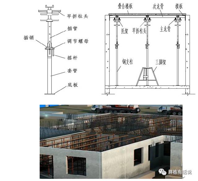 PC-H-GZC系统主要包括早拆柱头、插管、套管、插销、调节螺母及摇杆等部件。套管底部焊接底板,底板上留有定位的四个螺丝孔;套管上部焊接外螺纹,在外螺纹表面套上带有内螺纹的调节螺母;插管上套插销后插入套管内,插管上配有插销孔,插管上部焊有中心开孔的顶板;早拆柱头由上部焊有U形板的丝杆、早拆托座、早拆螺母等部件组成;早拆柱头的丝杆坐于插管顶板中心孔中;通过选择合适的销孔插入插销,再用调节螺母来微调高度就可实现需求的支撑高度。