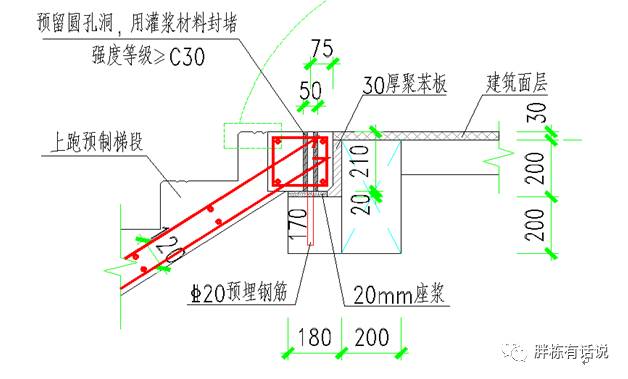 3、楼梯段上部支座需预埋钢筋20三级钢进行只做链接,混凝土浇筑楼梯梁支座时,预埋钢筋即使产生很小的位移也会对楼梯段安装对齐带来很大的困难。