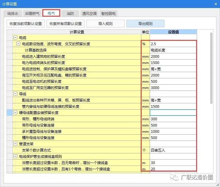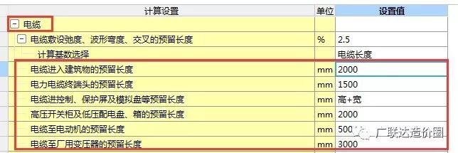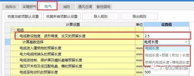 电缆需要按照2.5%计算敷设驰度,关于计算基数软件提供了3种方式,以满足不同地区不同的算量要求。