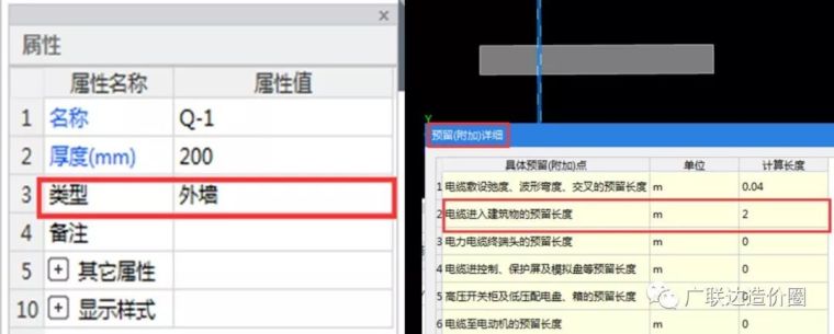 情况1:电缆进入建筑物时要计算2m的预留长度,软件中只要电缆通过外墙,在计算电缆长度时就会考虑增加2m的预留长度(注意墙的类型要设置为外墙)。