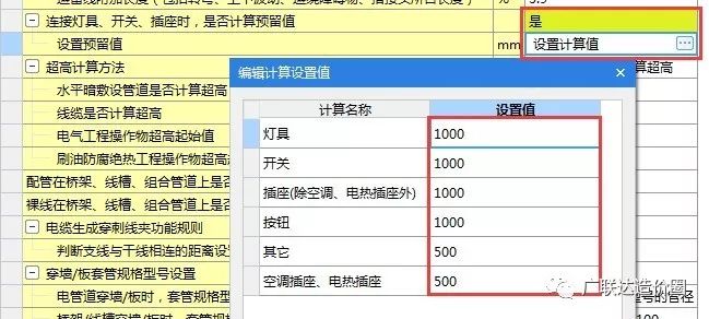 这条计算设置的使用原则为:如果定额中包含了这部分的预留,则按照软件默认的否进行设置即可。如果定额中未包含需要单独计算的话,则将此条计算设置改为是,然后根据需要进行预留值的设置,如下图:
