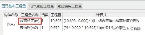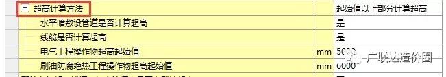 如上图可以设置工程中是否计算超高,软件默认当构件高度超高5m时,水平暗敷的管和线缆都会计算超高工程量,如下图所示: