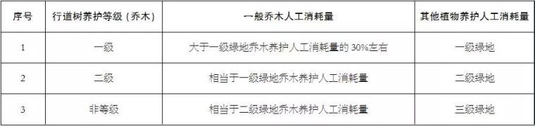 行道树养护等级划分:行道树乔木养护划分为两级(即一级养护和二级养护),道路范围内其他园林植物养护,可参照绿地养护等级中对应的一级或二 级养护定额计算费用。养护等级以外的行道树可依据一般绿地二级养护定额项目计算费用,详见表2。