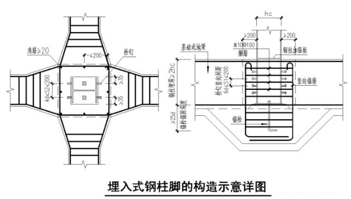 所谓埋入式柱脚是指将钢柱底端直接埋入混凝土基础筏板、地基梁或地下室墙体内的一种刚性连接的柱脚。其特点是埋入相对自身绝对刚性的基础中而形成刚性固定柱脚节点。这种柱脚构造可靠,常用于高层钢结构框架柱的柱脚。