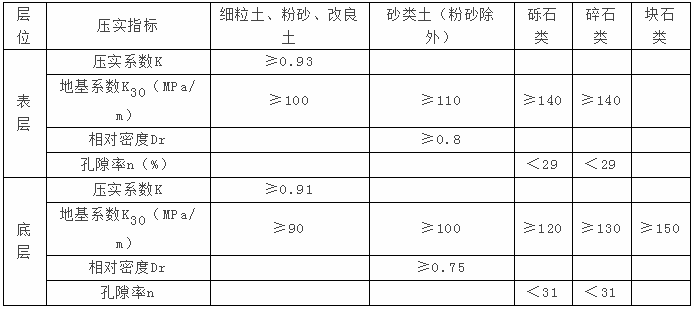 试验人员应根据填料的不同选定不同的检测方法,对改良细粒土应采用压实系数和地基系数为控制指标;对砂类土及细砾土、碎石类及粗砾土应采用孔隙率和地基系数作为控制标准。