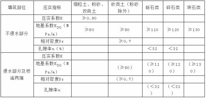 注:括号内为砂类土(粉砂除外)、砾石类、碎石类、块石类中渗水填料的压实标准。K30为直径30cm平板荷载试验的地基系数;K为重型击实试验的压实系数。