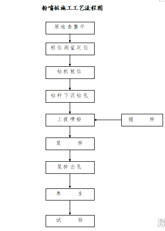3.l 施工工艺流程:整平原地面放样钻机就位钻杆下沉钻进上提喷粉复搅提杆出孔钻机移位。