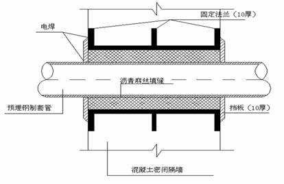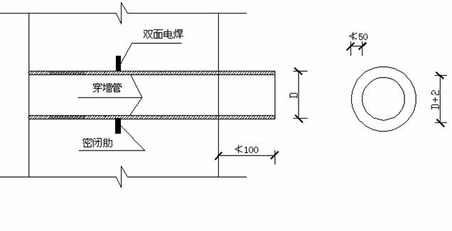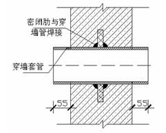 (2)带密闭肋的穿墙套管。这种套管可分为两种:一种是柔性防水套管,主要运用在对防震要求较高的外墙内,另外一种是刚性防水套管,主要运用在一般外墙以及无抗力要求的密闭墙内。穿墙套管伸出墙面段大于40mm。