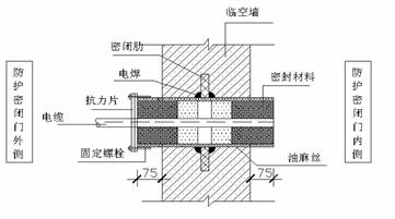 (3)带密闭肋、抗力片的穿墙套管。这一类主要运用在有抗力要求的临空墙、顶板、相邻单元隔墙内。穿墙套管中间带密闭肋,两侧分别设固定法兰。密闭肋应居中,抗力片面应与结构完成面平。密闭翼环、法兰宽为100mm,厚度不小于10mm。穿墙套管内径应大于穿墙管外径的3040mm,便于用密封材料填塞密实。片面认为套管管径比工作管管径大2号的说法是不正确的。