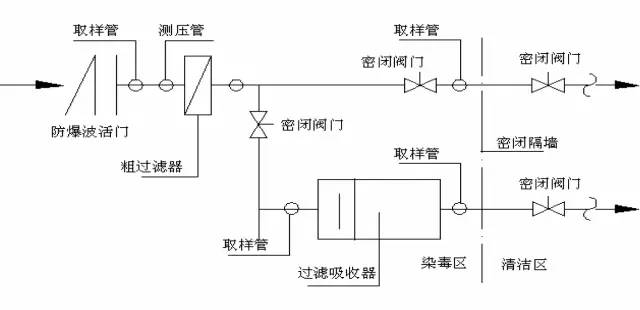 分析:在滤毒器、过滤吸收器进出风口处均应设置测压管,并且在连接管路上设置测量气体浓度的取样管,通过滤尘器和过滤吸收器阻力变化,及时掌握滤尘和滤毒能力(如下图)。清洁式管路上应在其两道密闭阀之间滤毒器前后各设置一根取样管,测压管和取样管应和风管同时制作。有的施工图无此要求,或者测压管、取样管遗漏、设置位置不正确。
