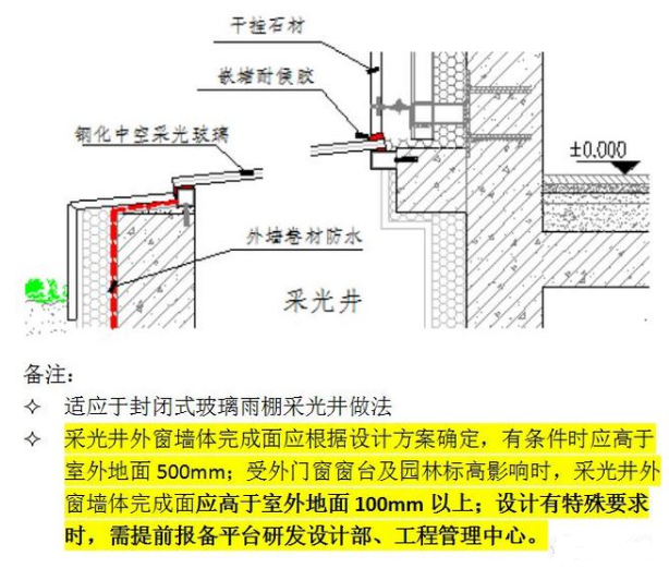 1) 玻璃与土建构造结合处应有可靠的收口处理,自玻璃边缘向内做一道防水(材料根据项目确定),外墙面防水高度不低于200mm;