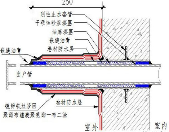如选用套管与外墙面平齐做法,项目公司应提前向平台工程管理中心、研发设计部报备,明确防水细部施工方案,且防水材料卷入套管内部深度不得小于50mm;出户管应施工至距离地下室外墙1.5米。