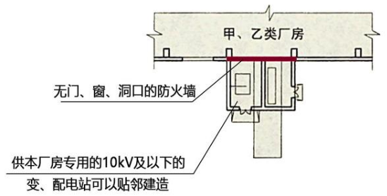 由于甲、乙类厂房的火灾危险性较高,通常情况下变、配电站不应设置在甲、乙类厂房内或贴邻建造。但是如果在生产上确有需要,允许在厂房的一面外墙贴邻建造专为甲类或乙类厂房服务的10kV以下的变、配电站,并用无门、窗、洞口的防火墙隔开。