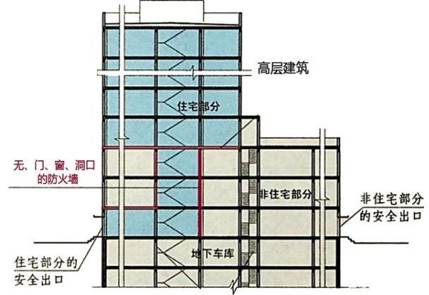 住宅建筑与其他使用功能的建筑合建时,由于其他使用功能部分的火灾危险性比住宅建筑大,因此需在水平与竖向采取防火分隔措施与住宅部分分隔。如果建筑整体为高层建筑,那么在水平方向应采用无门、窗、洞口的防火墙分隔。