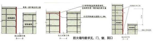 防火间距是一座建筑物着火后,火灾不会蔓延到相邻建筑物的空间间隔,它是针对相邻建筑间设置的。不同性质的建筑之间的防火间距都有各自的标准,但是有时确因空间限制,防火间距无法达到标准要求,可以通过设置符合要求的防火墙,来使防火间距的要求降低乃至不限。这种情况下设置的防火墙不允许开始门、窗、洞口。
