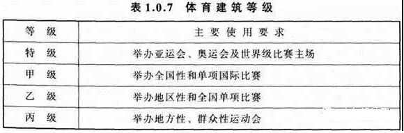 《体育建筑设计规范》JGJ31-2003第1.0.7 体育建筑等级应根据其使用要求分级,且应符合表1.0.7的规定。