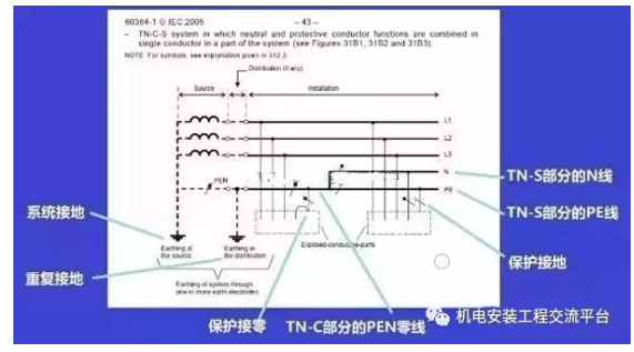 IEC还把TN-C系统与TN-S接地系统联合起来,形成TN-C-S接地系统。
