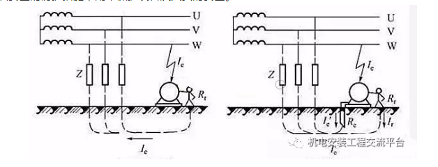 用电设备的外壳执行保护接地后,一旦发生碰壳事故,由于用电设备的外壳为零电位,确保了人身安全防护。同时,故障电流形成接地电流,经过地网再返回变压器中性点。由于地网的阻抗较大,因此故障电流较小,无法启动断路器或者熔断器执行线路保护。这时,就需要在系统中安装漏电保护器来执行线路保护。