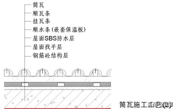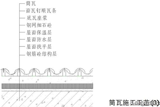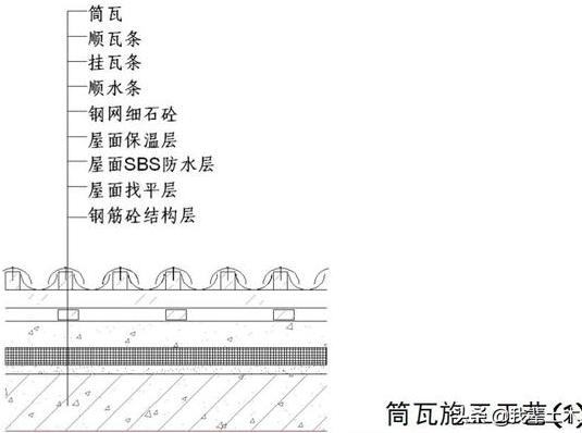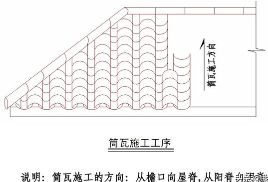 1.施工工序依次为:混疑土结构层ー找平层一防水层保温层-钢网砼保护层ー顺水条一挂瓦条一顺瓦条一筒瓦。