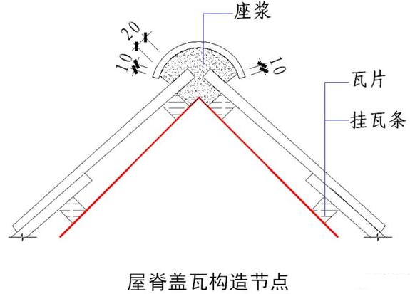 4.屋檐要平直,脊瓦搭口和脊瓦与盖瓦的缝隙、斜沟瓦与排水沟的空隙,均应用麻刀灰浆填实抹平,封固严密。