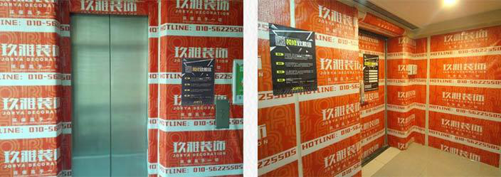 为了防止装修中磕磕碰碰,对电梯口和入户门造成损伤,需要在施工开始前对其进行保护。并且,粘贴专用装修致歉信及工程公示门贴。