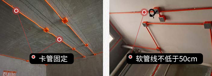 顶面铺管布局合理,管卡固定牢固;灯位预留电线套软管,长度不低于50cm。