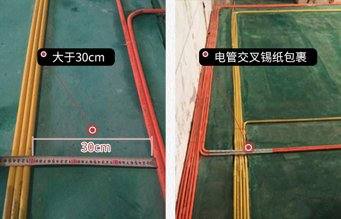 强弱电管铺设间距大于30cm,电管交叉处采用锡纸包裹,可以有效防止信号干扰。