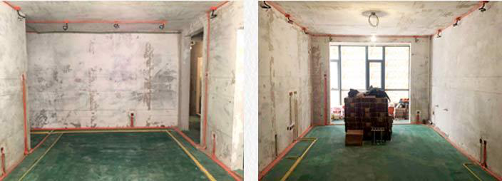 墙顶地面拆除完成后,进行施工基准弹线。水电改造开槽需要先弹线定位,标记水管电线的位置,走向要求横平竖直。