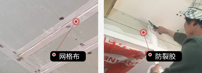 石膏板吊顶统一采用网格布与防裂胶带结合处理,有效防止后期接缝开裂。