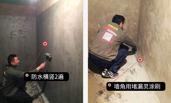 防水需横竖交错涂刷2遍,然后墙角及管道周边用堵漏灵涂刷,防止渗水漏水现象的发生。