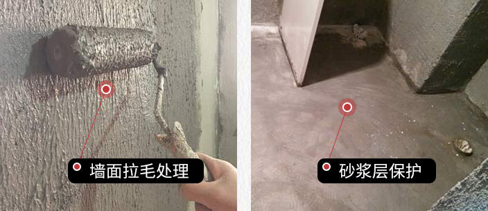 闭水试验工程完结后,墙面统一拉毛处理,可以提高墙壁粘结力,保证后期瓷砖铺贴稳妥牢固。地面必须采用砂浆层保护,以达到防水目的。