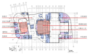 由于建筑室内空间效果需要,上部结构存在较多处的大跨和悬挑部位。剧院观众厅跨度31.4米,剧院大厅、舞台、排练厅上空跨度约20~25米。大跨度构件采用型钢混凝土框架。