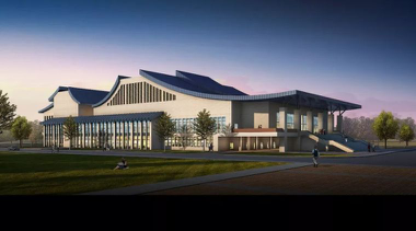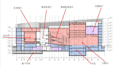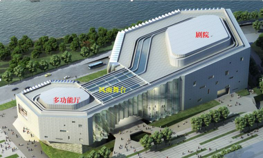 内江大剧院总建筑面积32615平方米,局部地下1层,地上共6层,结构平均高度33.70m,最大结构高度约42.10m。地上建筑依据建筑功能主要划分为三个分区:两侧分别是剧院区和多功能厅,中部为风雨舞台。三