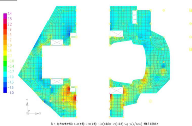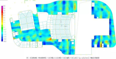 由于建筑功能的划分需要,南北两个功能区之间仅以少量梁板构件连接,有效楼板宽度小于典型有效楼板宽度的50%。为保证水平力的有效传递,将连接处楼板板厚适当加厚,并对开洞区域楼板进行应力分析,满足大震不屈服的性能化要求。同时在歌剧院观众厅等连接处适当增加剪力墙,保证水平力传递的连续性。