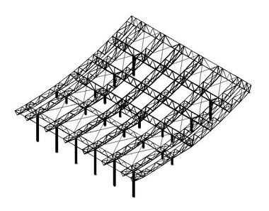 本项目屋面为弧形坡屋面,象征着知识海洋上的层层波浪,也寓意着学校的展翅高飞,是项目的重要表现形式之一。结构结合建筑造型,采用了交叉管桁架的结构体系。由于建筑室内空间效果需要,桁架下部的柱网与桁架存在错位,同时桁架上方吊挂有双层的设备平台,给结构设计带来了一定的挑战。