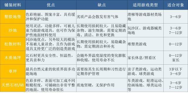 建议多使用松软的土地、草地、沙地及木板和木屑地面。另外因为儿童对地面的注意力会远比成人高,建议注重场地地面的设计,应提供富有变化的高差和质感。如光滑的、粗糙的、软质的、硬质的、干沙的、湿沙的、草地、砖地、石材、水泥、树皮等
