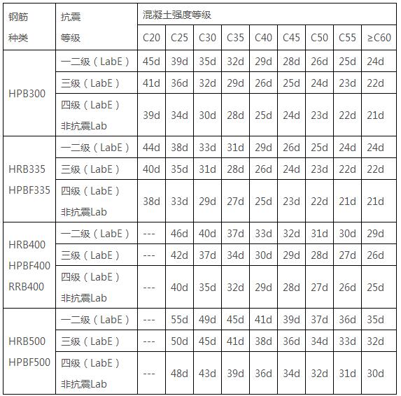 表2 受拉钢筋基本锚固长度Lab、LabE