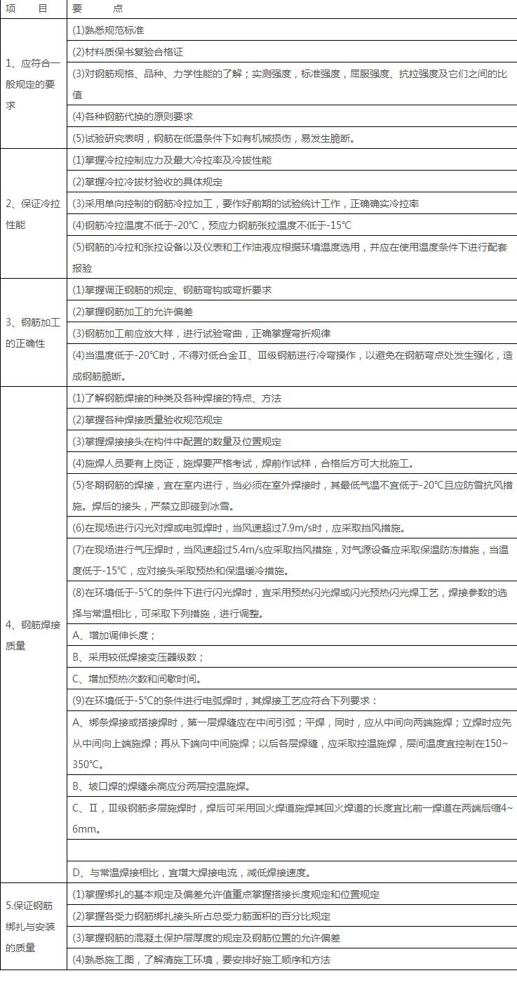钢筋工程是钢筋混凝土结构中的主要受力材料,它与混凝土材料的结合才能构成坚固的实体,使之应用于安全度要求很严的建筑产品中,如钢筋工程中任一项内容未严格按规范设计要求进行配制和施工,轻则影响使用功能,重则造成建筑物的倒塌。冬期施工的钢筋冷拉,张拉与焊接应符合冬期施工规程中的规定,严格控制负温施工条件及温度界限。
