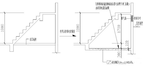 在主体施工阶段,环境设计尚未明确时,可在连接台阶的柱上预留梁插筋以便今后浇注结构板,进而在结构板上作砼或砖砌台阶。因室外环境标高不明确,梁插筋预留位置可适当放低(按土建室外标高下400mm)。室外环境标高确定后,在预留梁插筋的高度位置浇注结构平板并相应调整台阶的级数。