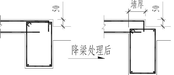 为避免住宅楼卫生间降板周边有梁在砌筑完成后形成反坎(砌筑墙体厚度与梁宽尺寸不一致),可降低梁标高5cm处理,注意降低梁标高时梁截面不变(如因降梁导致入户门高度变化应及时与我司联系)。降梁处理如下图所示: