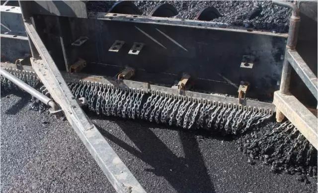 (10)调好螺旋布料器两端的自动料位器,并使料门开度、链板送料器的速度和螺旋布料器的转速匹配。螺旋布料器内的混合料略高于三分之二布料器为宜。熨平板挡板前混合料的高度在全宽范围内保持一致,以减少离析。
