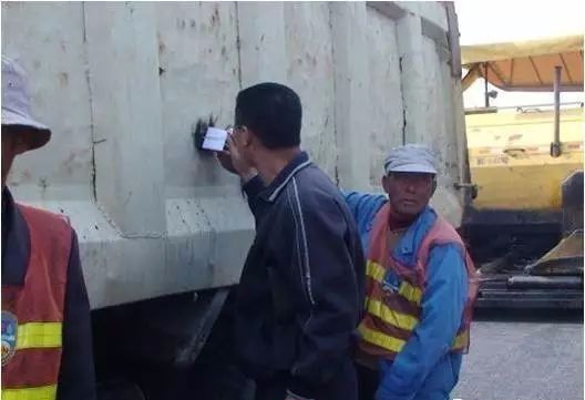 (2)运输车在运输时,必须加盖棉被,以防沥青温度散失,运输过程中尽量避免急刹车,以减少混合料离析。卸料时,运料车到达摊铺机前10-30cm处停止,不得碰撞摊铺机,挂空挡靠摊铺机推动前进。