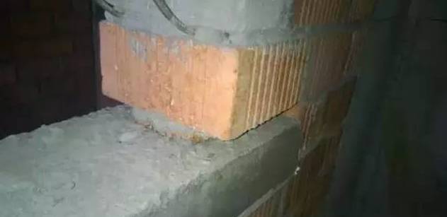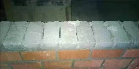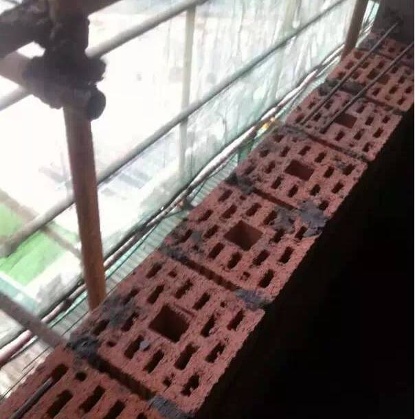 四、窗台梁处用水泥砖找模数,且未满刀灰,有渗漏隐患,砌筑前提前算好皮数划线,砌筑时挂皮数杆