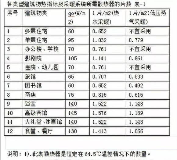 根据热平衡原理,将建筑物热指标和所需散热器片数列表-1(以四柱640型为准)。