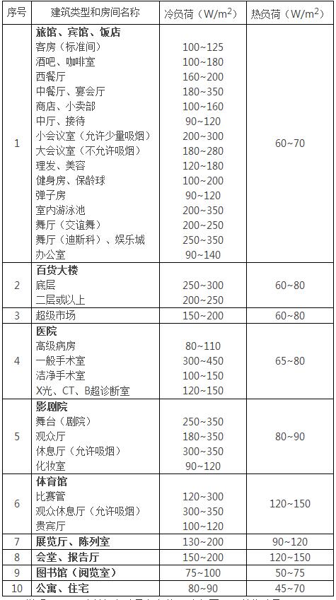 各类房间空调负荷分类指标指标