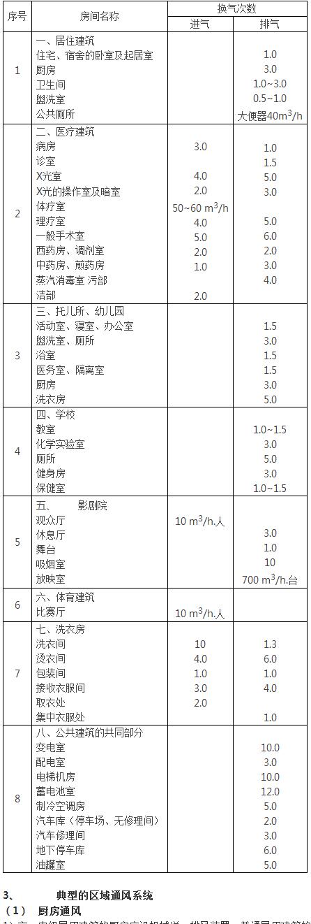 1)高、中级民用建筑的厨房应设机械送、排风装置;普通民用建筑的厨房可设局部排气风扇。厨房的排风系统的风机排出口一般设在建筑物楼面。风机可采用普通的离心风机,但必须在风机下部加设排油污装置。