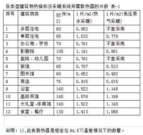 根据热平衡原理,将建筑物热指标和所需散热器片数列表1(以四柱640型为准)。
