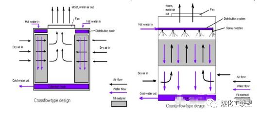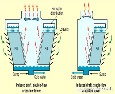 冷却水从顶部进入,流经填料层;空气从一侧或两侧进入,诱导风机使空气横向流过填料层。