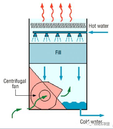 空气从底部强制吹入,在填料内与水接触蒸发部分冷却水,从而降低水温。